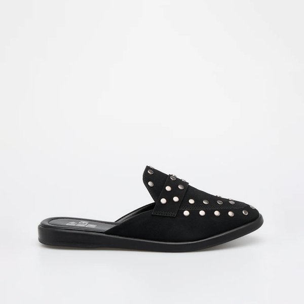 O Mule Patrícia é uma afirmação de estilo que combina o clássico com o ousado. Seu design apresenta um acabamento em material preto fosco adornado com aplicações de tachas metálicas por toda a superfície, criando um visual marcante e cheio de atitude. O bico levemente fino confere um toque de sofisticação, equilibrando perfeitamente a elegância do mule com a irreverência das tachas.