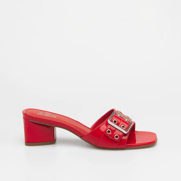 Este tamanco é uma declaração de estilo ousada. O cabedal é realçado por uma maxi-fivela robusta e um detalhe de ilhoses que adicionam um toque rocker e moderno. No acabamento envernizado vibrante (como o vermelho) ou elegante (como o preto), ele é a dose de personalidade que faltava no seu look.