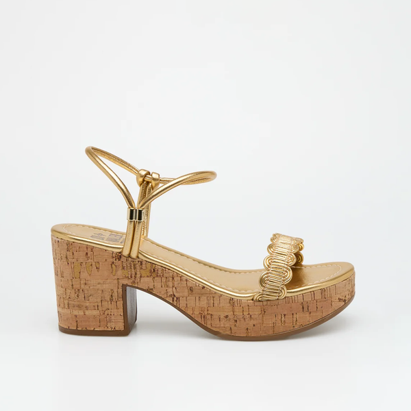 Com acabamento dourado e tiras delicadas, essa sandália combina o charme do brilho metalizado com a modernidade do salto em cortiça. Um modelo cheio de personalidade, que transforma qualquer look em uma produção sofisticada e atual.