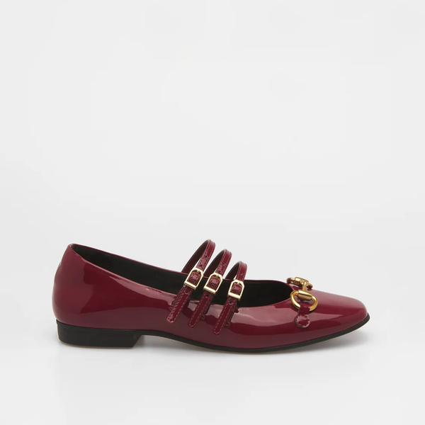 A Sapatilha Positano exibe um design que combina o bico quadrado moderno com um toque vintage de luxo. O destaque fica por conta do detalhe horsebit (freio) dourado na ponta e das três tiras finas que remetem ao clássico modelo Mary Jane. O acabamento em verniz (ou material liso) intensifica a sofisticação, criando uma peça statement elegante e atemporal para o seu look.