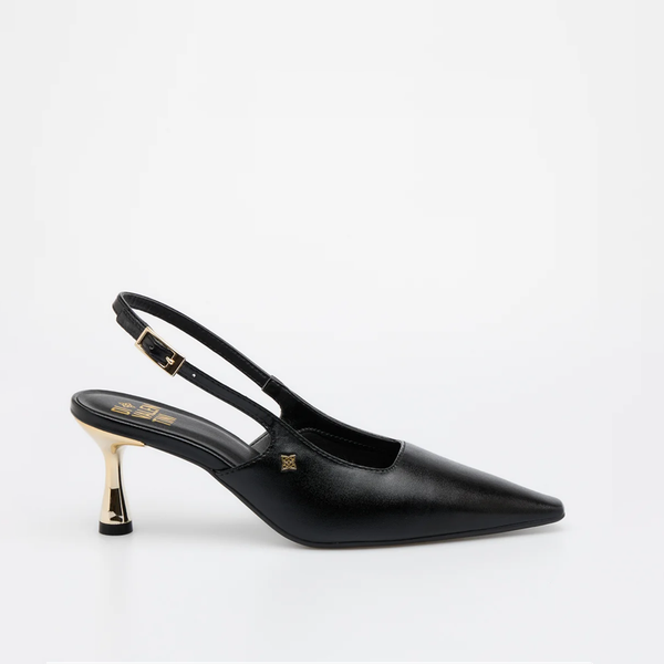 O Sapato Estela combina o clássico bico fino com um toque de modernidade através do seu salto médio metálico em tom de joia, um elemento escultural que adiciona luxo e é o ponto focal do design. Seu design elegante é complementado pela tira slingback com fivela ajustável, garantindo um visual sofisticado e feminino. É um modelo perfeito para quem deseja um visual marcante e refinado, ideal para eventos, trabalho ou ocasiões especiais.