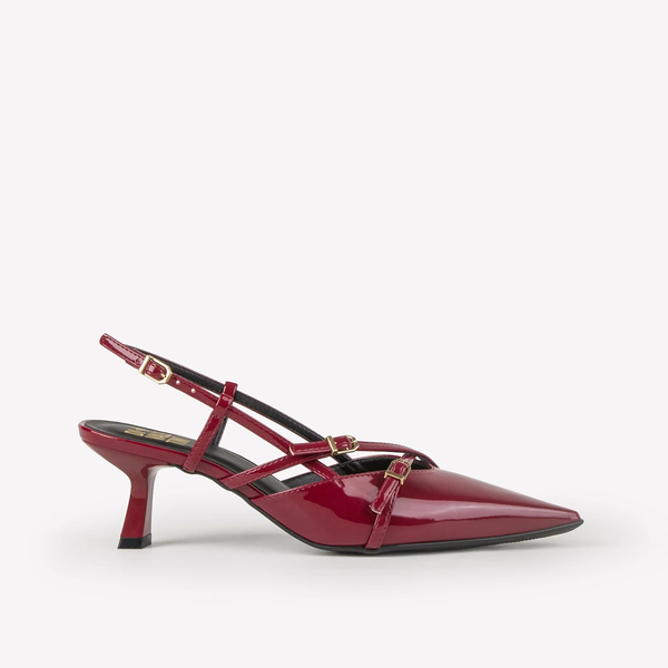 O Slingback Diana é uma afirmação de estilo com sua combinação de ousadia e sofisticação. O verniz preto brilhante e o bico fino criam um visual clássico, que é modernizado pelo salto e sola vermelhos, um toque de luxo e poder instantaneamente reconhecível. As fivelas triplas na gáspea, com seu design distinto, adicionam uma dose de charme e atitude vintage, tornando este sapato a peça-chave para um visual inesquecível, seja ele formal ou elegante-casual.