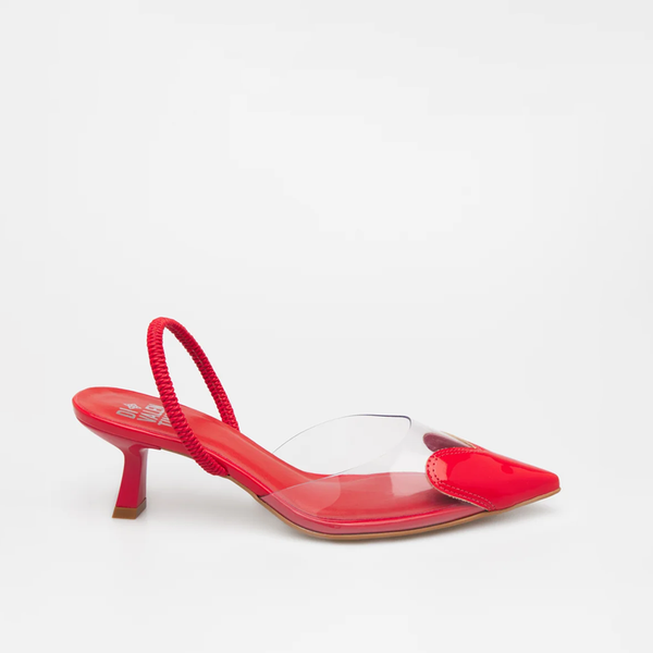 O grande destaque é, sem dúvida, o coração em verniz vermelho vibrante no bico fino. É um detalhe encantador que transforma um calçado clássico em uma peça de moda arrojada e cheia de personalidade.
