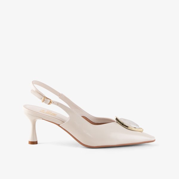 A Slingback Julli é a definição de uma peça statement para o closet feminino. Seu design é protagonizado por um ornamento orgânico imponente no bico fino: uma pedra em tom perolado envolta por uma moldura dourada, que confere um ar de joia ao calçado. Confeccionada em um tom off-white minimalista, ela apresenta linhas fluidas e um recorte lateral que valoriza a curvatura dos pés. O salto taça médio finaliza o visual com uma estética moderna e arquitetônica, tornando este modelo a escolha ideal para eventos que exigem um toque extra de luxo e personalidade.