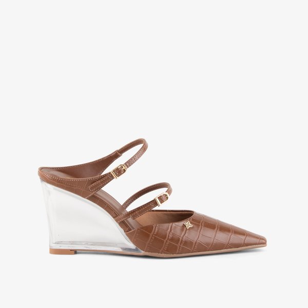 Esta peça é uma verdadeira declaração de estilo que une a sofisticação clássica à vanguarda do design contemporâneo. O grande protagonista é o salto anabela em acrílico, que cria um efeito visual de leveza e transparência, elevando qualquer look ao status de passarela. O cabedal apresenta a luxuosa textura croco com acabamento em verniz, finalizado por um elegante bico fino que alonga a silhueta com precisão. O jogo de tiras triplas com fivelas delicadas sobre o peito do pé adiciona uma camada extra de detalhamento refinado, transformando o sapato em um item de design indispensável para quem busca modernidade.