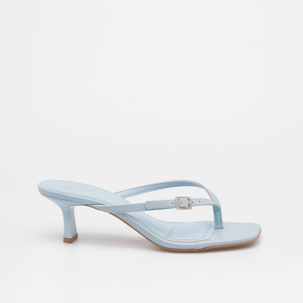 Este tamanco é a definição do estilo minimalista chique. O design de tiras finas (estilo thong sandal) e o bico levemente quadrado trazem uma referência vintage moderna. A cor Azul Bebê é delicada e trendy, adicionando um toque de cor suave, enquanto a fivela brilhante na tira eleva a sofisticação. É a peça perfeita para adicionar elegância e um toque de leveza a looks casuais de verão.