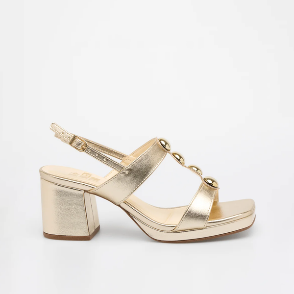 Prepare-se para uma obra de arte nos seus pés! Esta sandália é uma celebração do design, onde cada elemento foi pensado para criar um impacto visual inesquecível. O acabamento metalizado dourado serve como tela para a maxi-aplicação de esferas que se alinham elegantemente no centro do pé, criando um efeito de colar delicado e poderoso. A combinação das tiras finas no peito do pé com a tira no tornozelo e o salto bloco estruturado resulta em uma silhueta equilibrada e moderna. É a escolha perfeita para quem busca um calçado que é ao mesmo tempo ousado, sofisticado e cheio de personalidade, capaz de transformar qualquer look em uma declaração de estilo.
